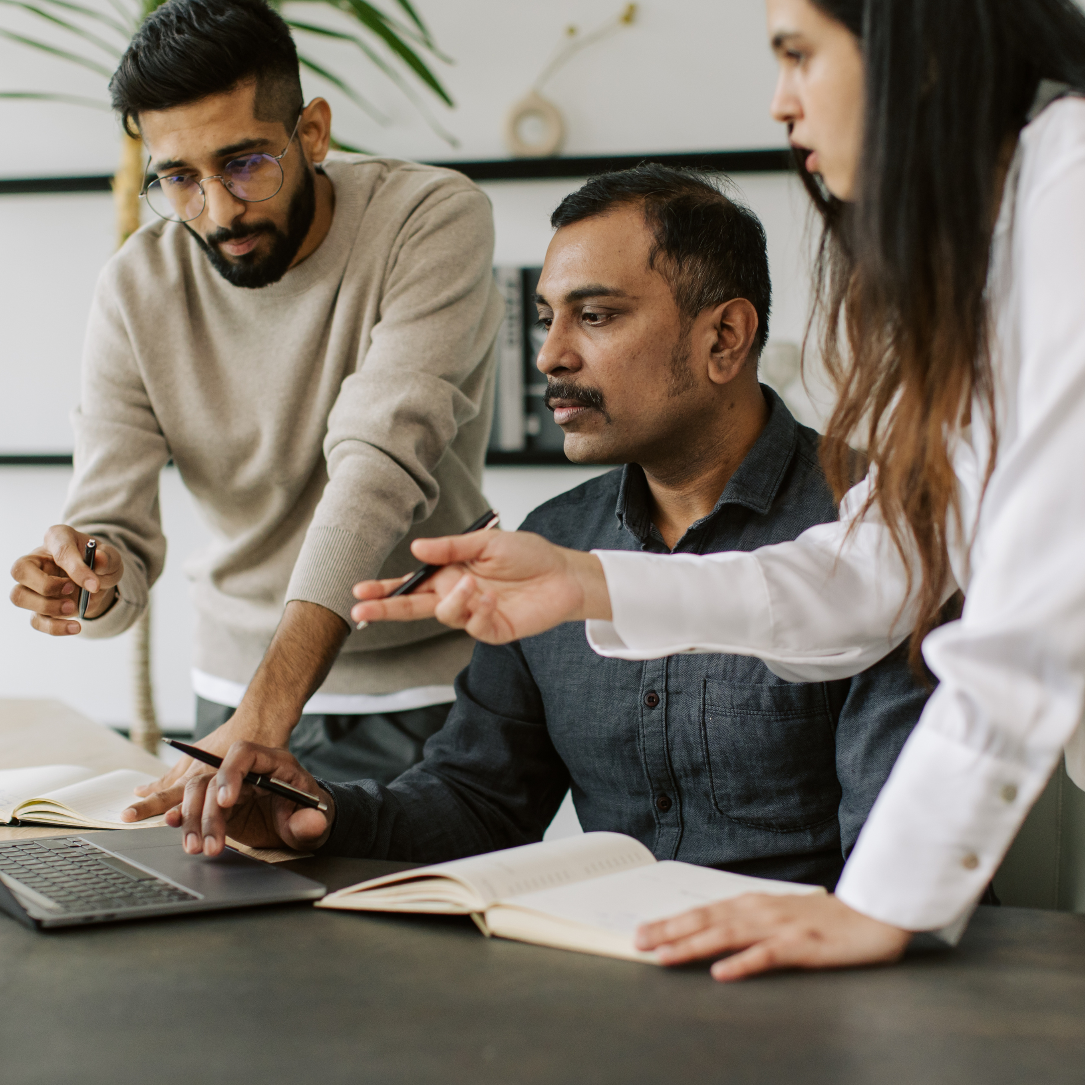 alt="Three people in a planning meeting, representing the collaborative and goal-oriented exit planning support offered by Sum of All Numbers."
